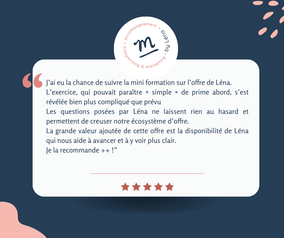 En revanche, au moment de passer à l’action et de mettre des mots sur ce que tu proposes, ça va peut être bloquer. C’est normal, il est toujours difficile de travailler sur sa propre activité, et ça génère souvent des questions ou des blocages.