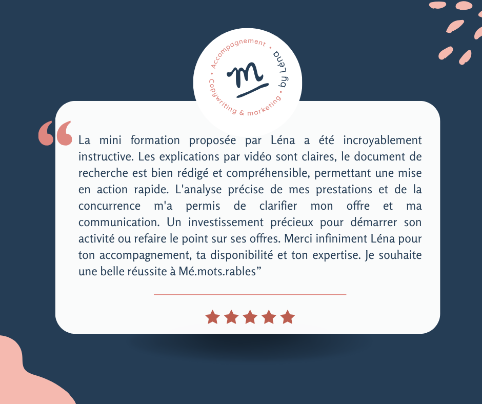 Après ton inscription, tu reçois la vidéo détaillée dans laquelle je t’explique pas à pas la méthode pour travailler sur ton offre et ton marché, et comment compléter le document d’analyse de ton offre.